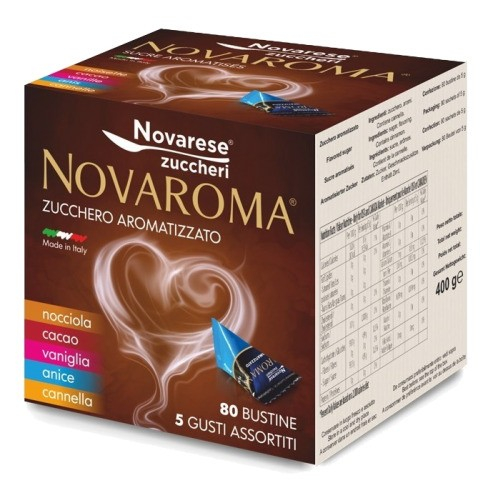 Set 80 pliculete zahar aromatizat Novaroma, arome de alune, cacao, vanilie, sambuca si scortisoara, ideal pentru cafea si ceai.
