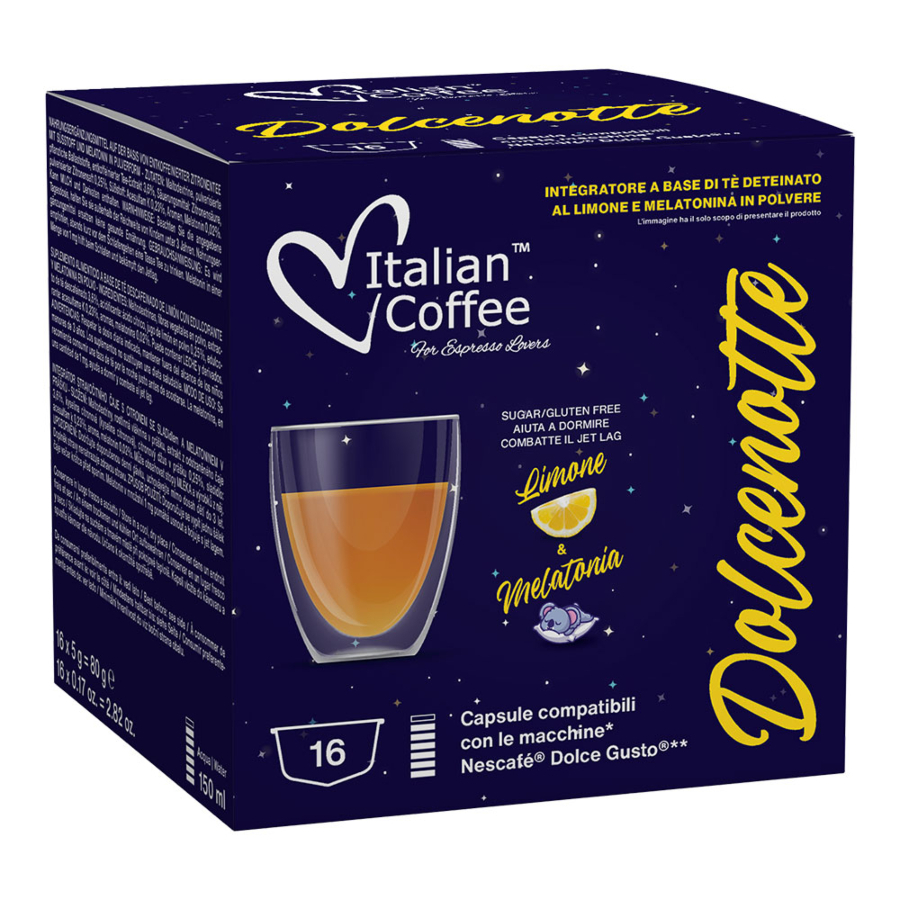 Capsule Ceai de Lamaie si Melatonina, Fara Teina, Dolce Notte Italian Coffee, 16 capsule, compatibile cu Dolce Gusto
